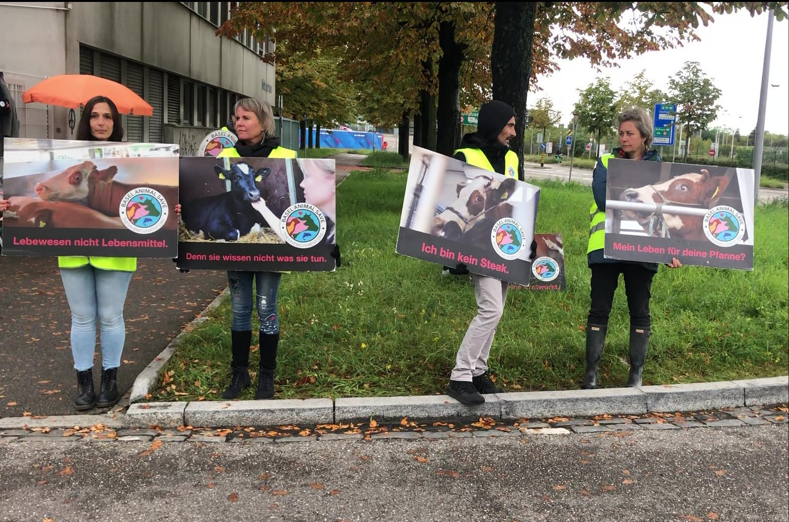 Es ist fünf Uhr früh an einem kühlen Montagmorgen im September, es hat soeben aufgehört zu regnen. Gute Neuigkeiten für die Handvoll Aktivisten, die sich am Eingang des Bell-Schlachtbetriebs in Basel, nahe des Flughafens zusammengefunden haben. In gelben Westen und mit Schildern und Bildern von traurigen Tieren bestückt, halten sie während fünf Stunden eine Mahnwache ab.