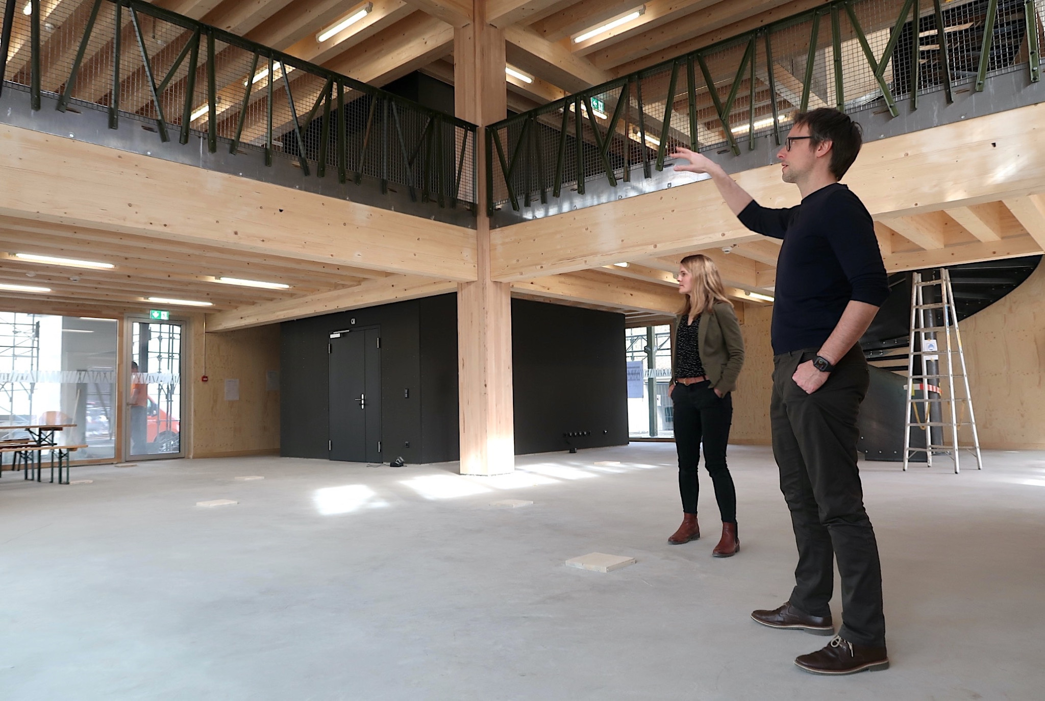An den Wänden hängen zahlreiche Planskizzen und Visualisierungen. Man sei im Zeitplan, auch wenn Lieferengpässe die Situation derzeit anspruchsvoll machten, erklärt das Duo.
