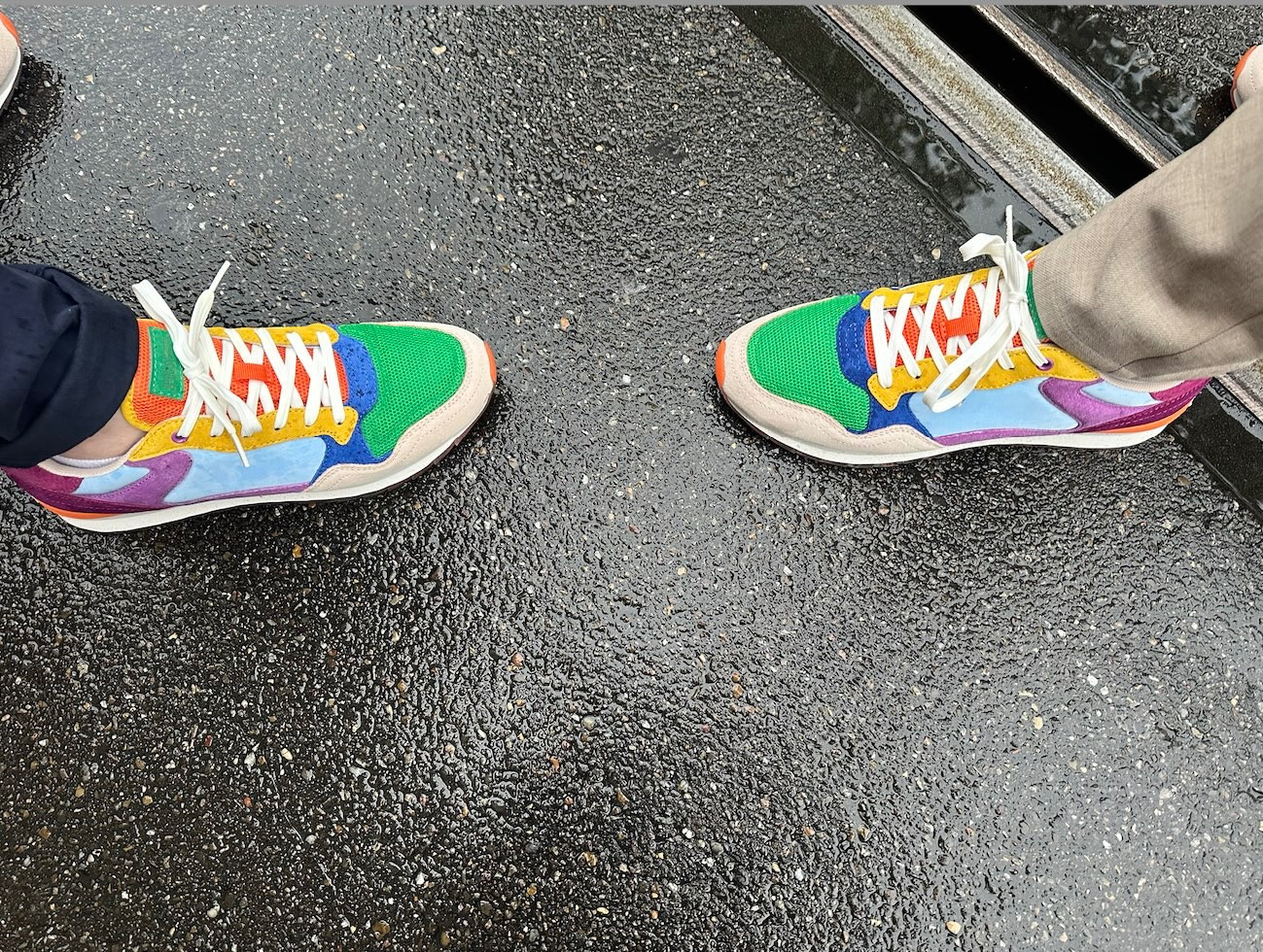 Er ist unterwegs mit seinem Stellvertreter Benjamin Koechlin, und nicht ohne Stolz verweisen die Beiden auf ihr Schuhwerk: Das Auge erblickt ein farbenfrohes Ensemble, welches ganz dem lebendigen Flâneur-Geist entspricht.