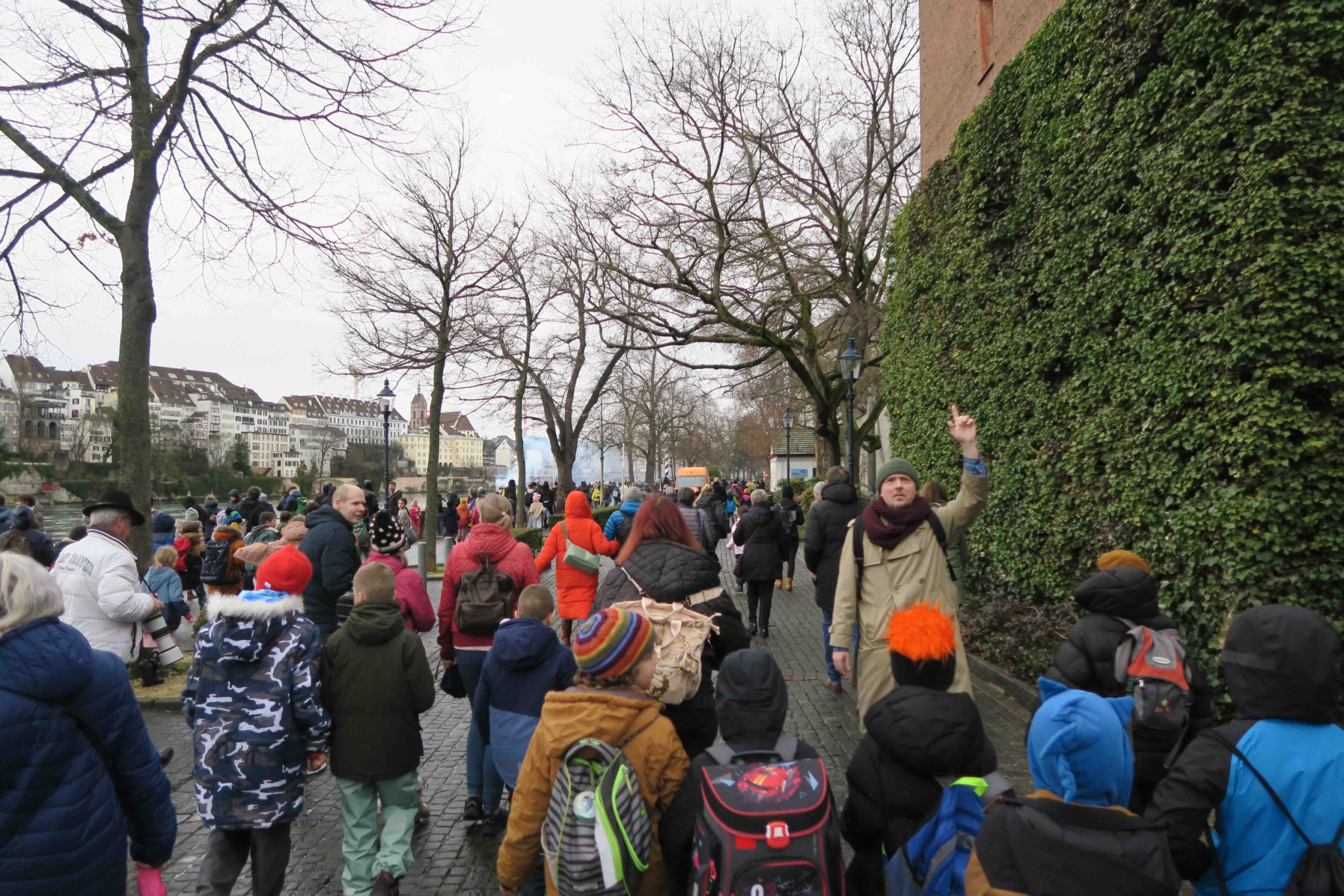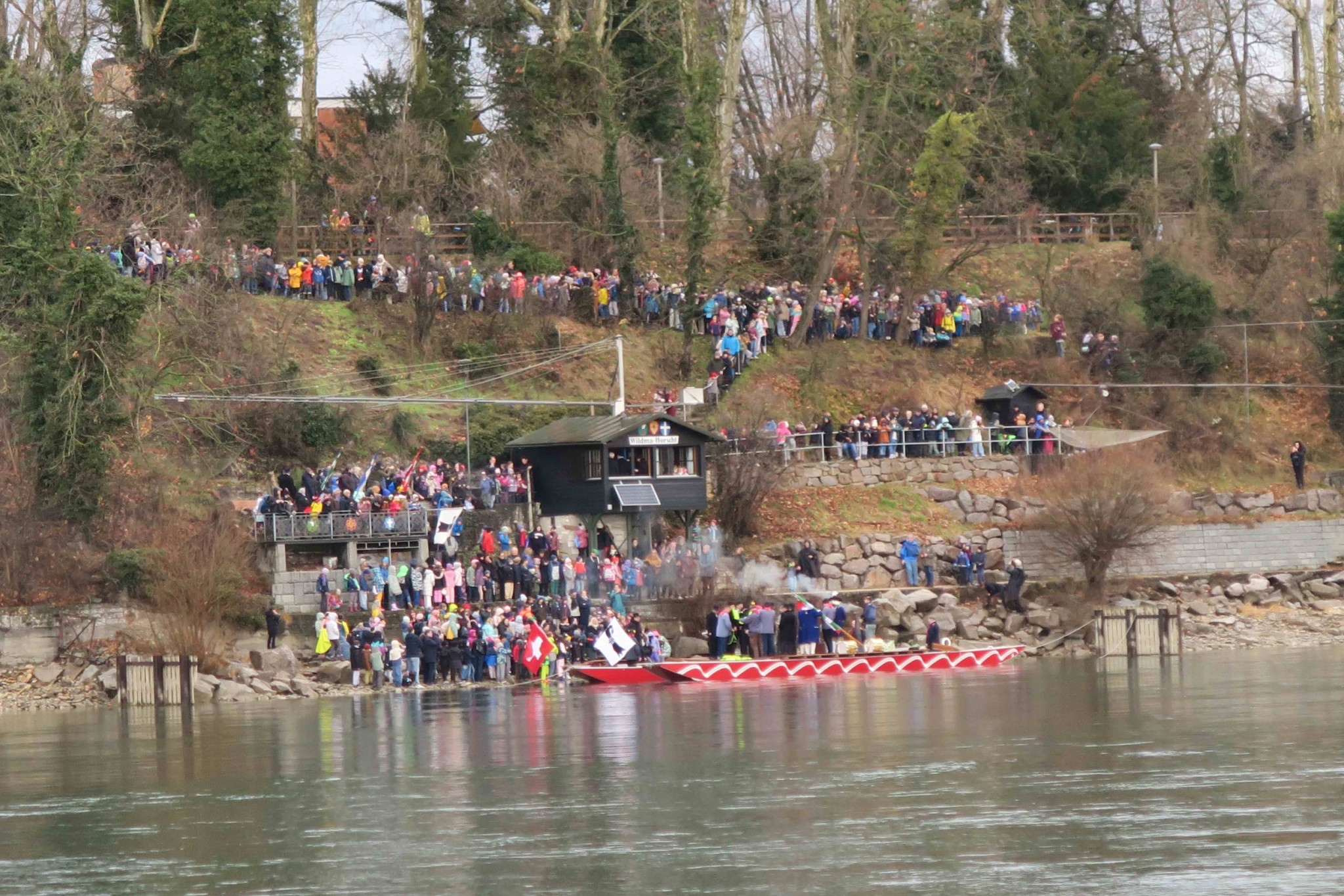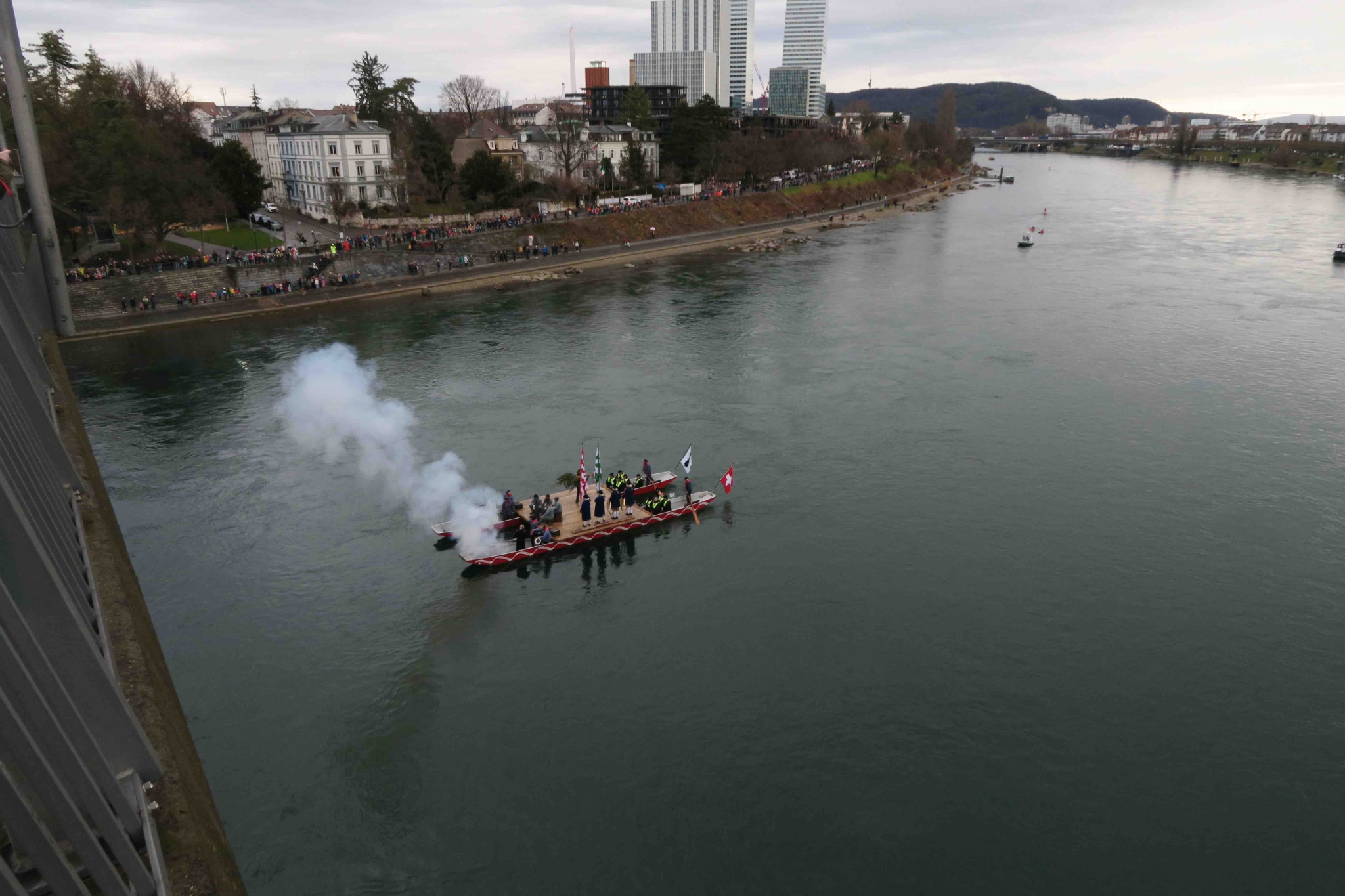 Zwischen dem Wildmaahorst oberhalb der Schwarzwaldbrücke und der Anlegestelle beim Kleinen Klingental säumen hunderte Schaulustige den Weg. Darunter hat es – wie jedes Jahr – viele Schulklassen. Erwachsene wie Kinder erfreuen sich ob des lebendigen Brauchtums und trotzen dem zwischenzeitlichen Regenwetter.