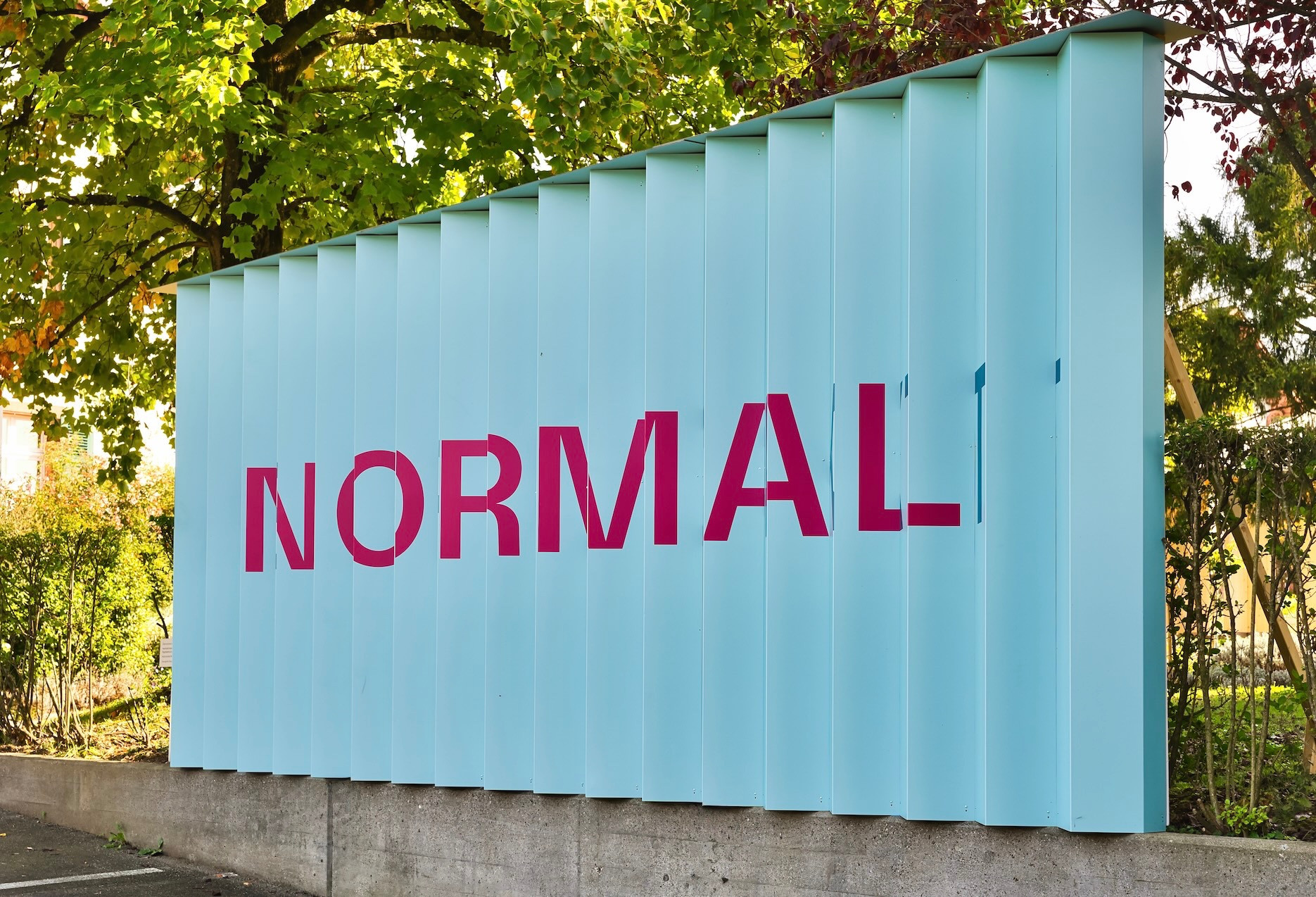 Wer bei der Sonnenhalde in Riehen vorbeikommt, wird beim Eingang neuerdings mit dieser Frage konfrontiert. Auf einer grossen Wandinstallation steht dort – je nach Standort und Blickwinkel – entweder «verrückt» oder «normal». Eine einfache Wortspielerei, die aber philosophisch und im Leben des Einzelnen weitreichend ist. Und vor allem: die den Betrachter herausfordert.