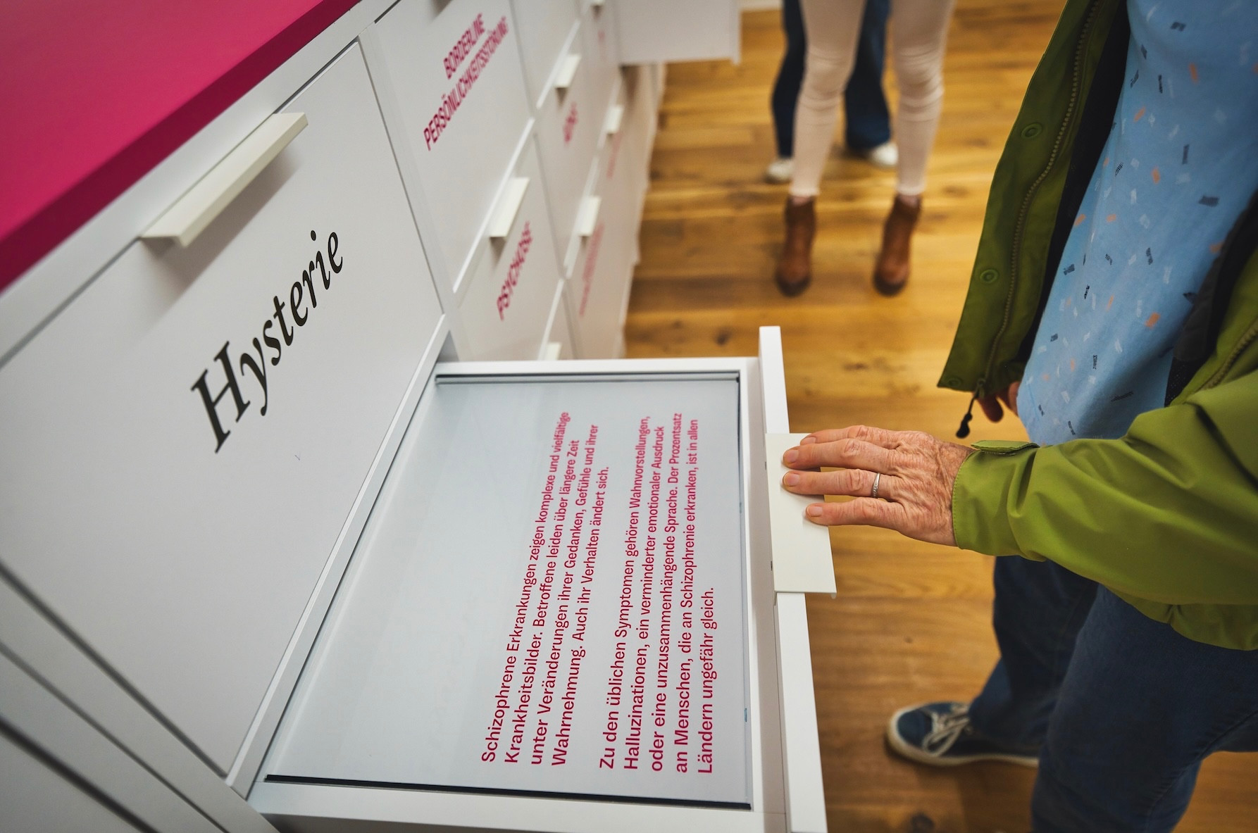 Ebenso fand eine aufwändig gestaltete Schubladenwand mit 33 Diagnosen den Weg zur Sonnenhalde in Riehen. Sie soll zum Ausdruck bringen, wie sich Diagnosen und gesellschaftliche Haltungen verändert haben – und wie sehr Psychiatrie immer auch ein Spiegel der Gesellschaft und ihrer Zeit ist.