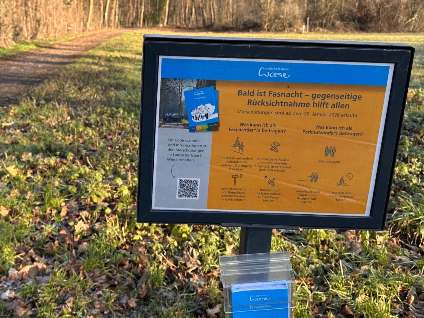 Im Landschaftspark Wiese kommen sich Fasnächtler und Parknutzer immer wiedermal in die Quere. Neue Schilder sollen für Ruhe sorgen.