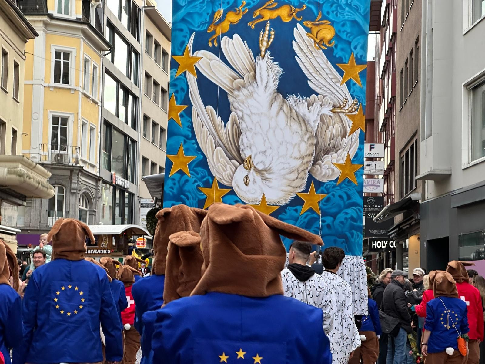 Der Fokus auf die Sujets zeigt: Es ist ein düsterer Jahrgang. Die Menschheit trachtet nach Frieden. So auch die Alte Stainlemer mit ihrer Friedenstaube im Sinkflug – «Krieg um Frieden».