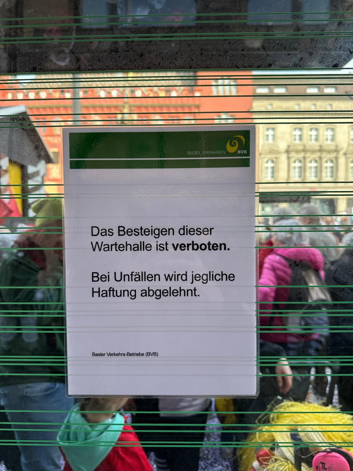 Die Basler Verkehrsbetriebe haben an verschiedenen Stellen Hinweise angebracht, dass das Besteigen der Wartehallen verboten sei. Man könnte am Wort «Hallen» hängen bleiben und sich fragen, wo denn diese Wartehallen zu finden sind. Oder einfach schmunzelnd weitergehen...