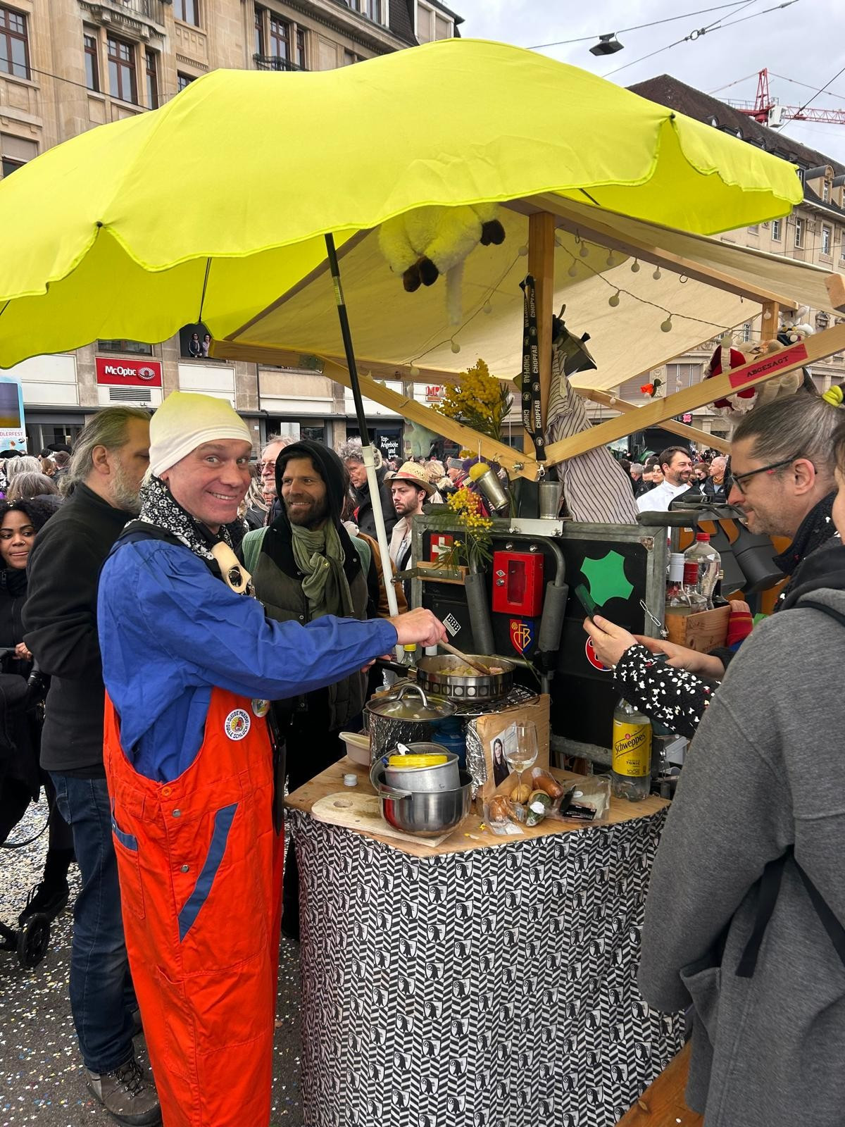 Wie jedes Jahr ist Lukas Holm von der BrauBudeBasel mit dem Fasnachtswägeli unterwegs. Gemeinsam mit Freundinnen und Freunden zieht er damit durch die Stadt und zaubert auf der mobilen Küche immer wieder etwas Essbares aus dem Ärmel. Nicht fehlen darf natürlich auch der Bier-Zapfhahn!
