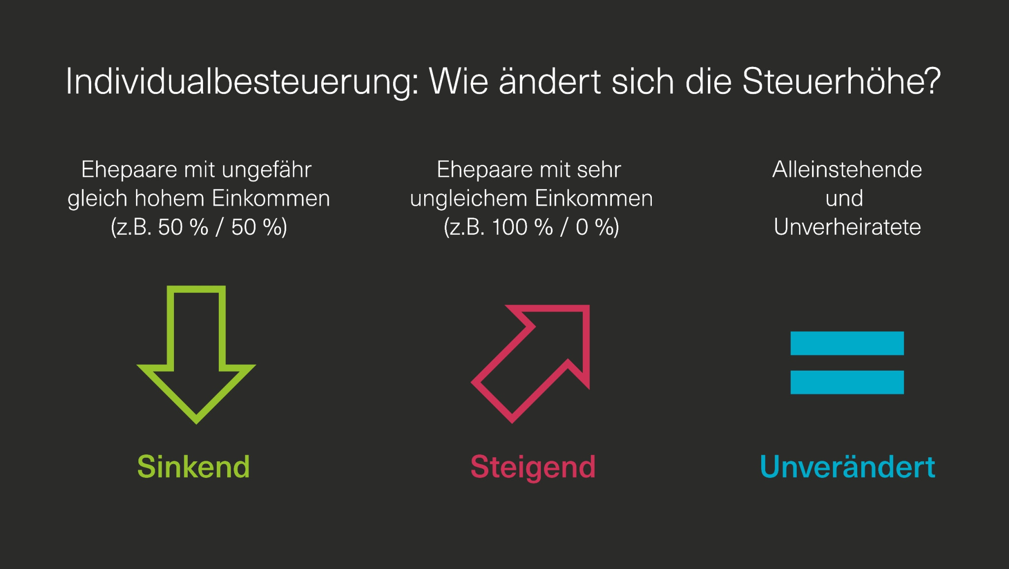 Der Bundesrat will eine neue Individualbesteuerung einführen. Das bedeutet, dass jede und jeder unabhängig vom Zivilstand eigenständig besteuert wird. Somit würde die Heiratsstrafe verschwinden. Befürworter sehen darin eine gerechtere Behandlung aller Lebensformen, weil die steuerlichen Nachteile für Ehepaare beseitigt würden, die heute durch das Zusammenrechnen der Einkommen und somit durch die gemeinsame Veranlagung entstehen.