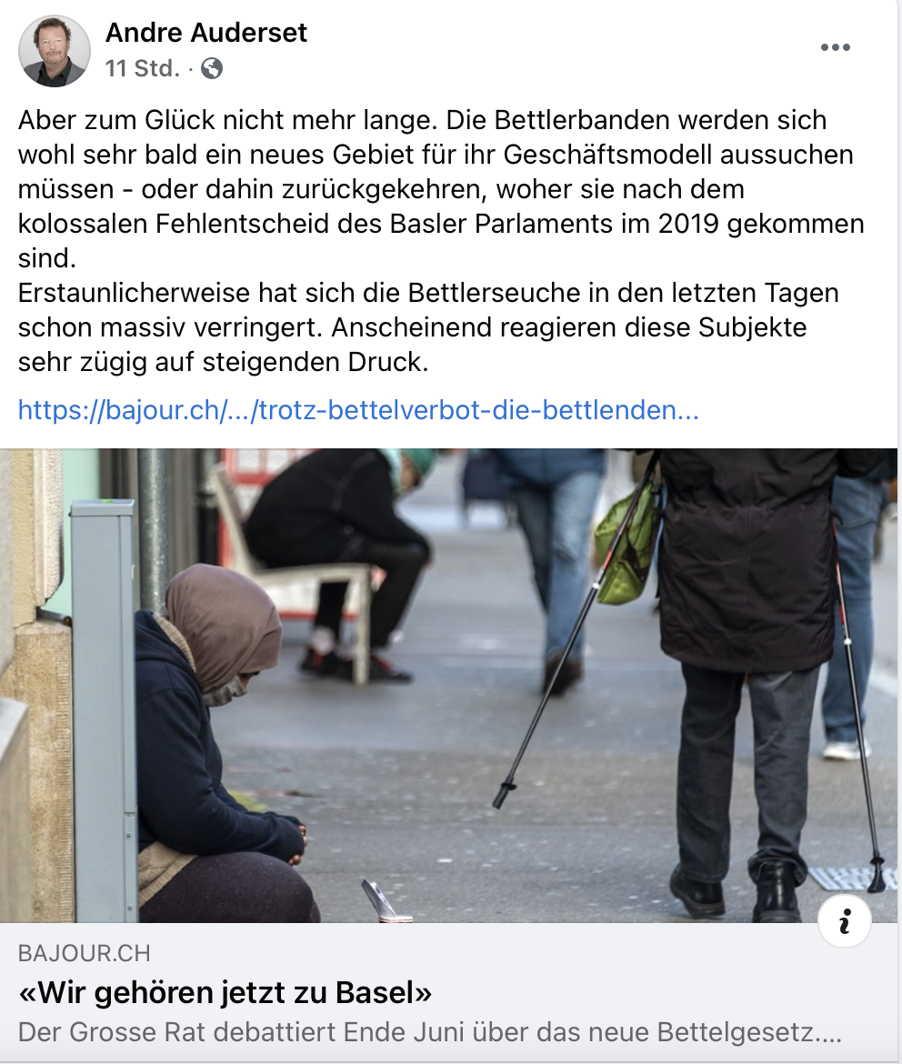Am späten Mittwochabend griff der Basler LDP-Grossrat André Auderset in die Tasten und postete auf Facebook einen Beitrag zur aktuellen Diskussion um das Bettelverbot.