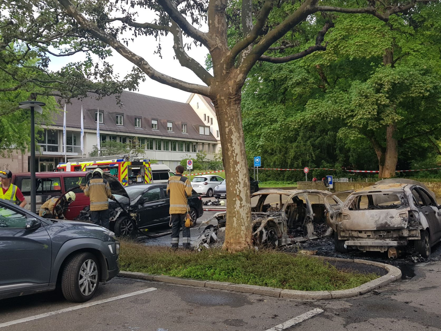 Gestern Sonntag kam es auf dem Parkplatz hinter der Gemeindeverwaltung in Riehen gegen 16.30 Uhr zu einem heftigen Brand, bei dem zwei Autos komplett zerstört und mehrere weitere Fahrzeuge beschädigt wurden.