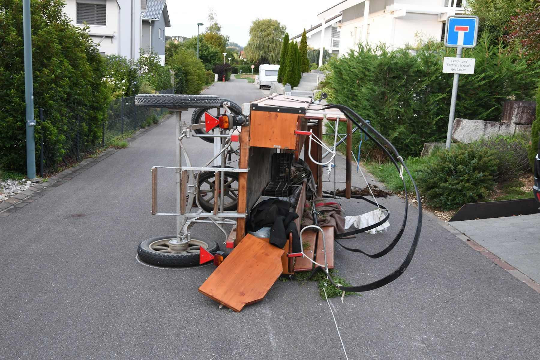 «Bei diesem Abbiegemanöver kippte der Bockwagen auf die rechte Seite. In der Folge gerieten die Pferde ausser Kontrolle und schleiften den auf der Seite liegenden Bockwagen hinter sich her», heisst es in der Medienmitteilung. Das Gespann konnte schlussendlich im Hofackerweg durch eine Drittperson gestoppt werden.
