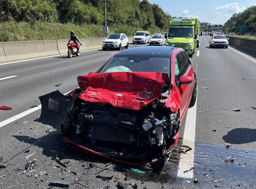 Durch die Wucht des Aufpralls wurde das Fahrzeug in einen schwarzen Opel geschoben, der wiederum mit dem Heck eines weissen VW kollidierte. Beim Unfall am Sonntagmittag wurden insgesamt sieben Personen verletzt und mussten durch den Rettungsdienst ins Spital gebracht werden.