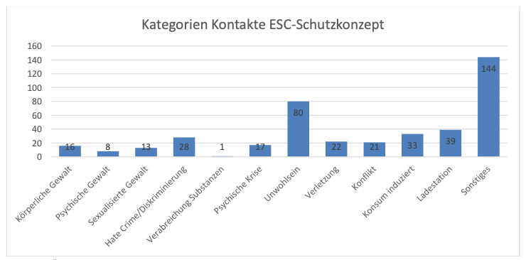 Insgesamt kam es zu 434 Kontakten mit den Angeboten des Schutzkonzepts. Dabei handelte es sich bei 66 Kontakten um strafrechtlich-relevante Vorfälle. Nicht immer war die Polizei und/oder das Sicherheitspersonal involviert, was für das JSD ein Zeichen dafür sei, dass «das ESC-Schutzkonzept eine Lücke füllen und die Arbeit der Blaulichtorganisationen und der privaten Sicherheits- und Sanitätsdienstleistenden im Sinne der Betroffenen wirksam ergänzen konnte.»