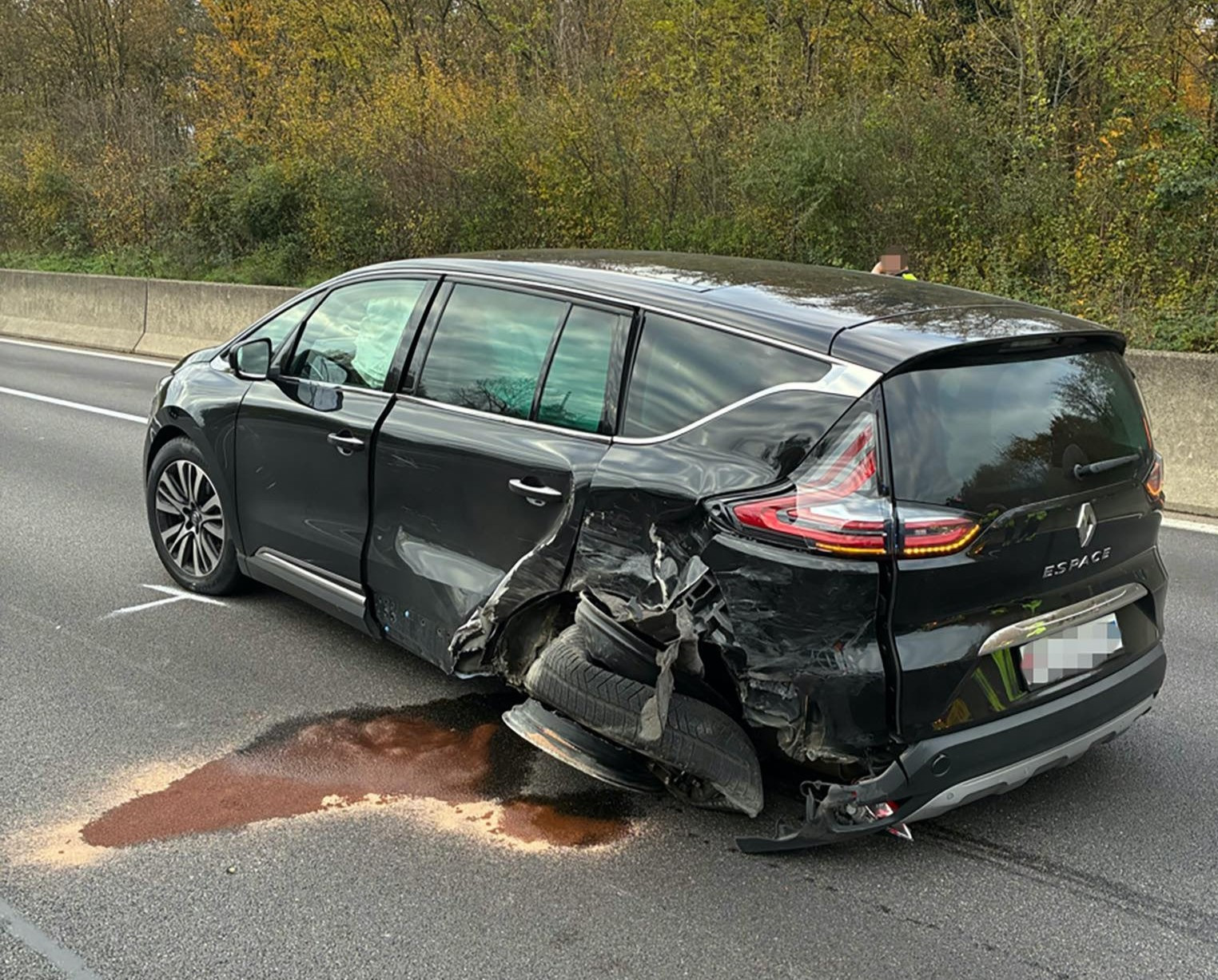 Als eine Patrouille auf ihn aufmerksam wurde, versuchte er, sich der Kontrolle zu entziehen und rammte kurz nach dem Schweizerhalletunnel einen schwarzen Renault (Bild). Zudem, so die Mitteilung der Polizei, stiess er mehrfach in die Fahrbahnbegrenzung.