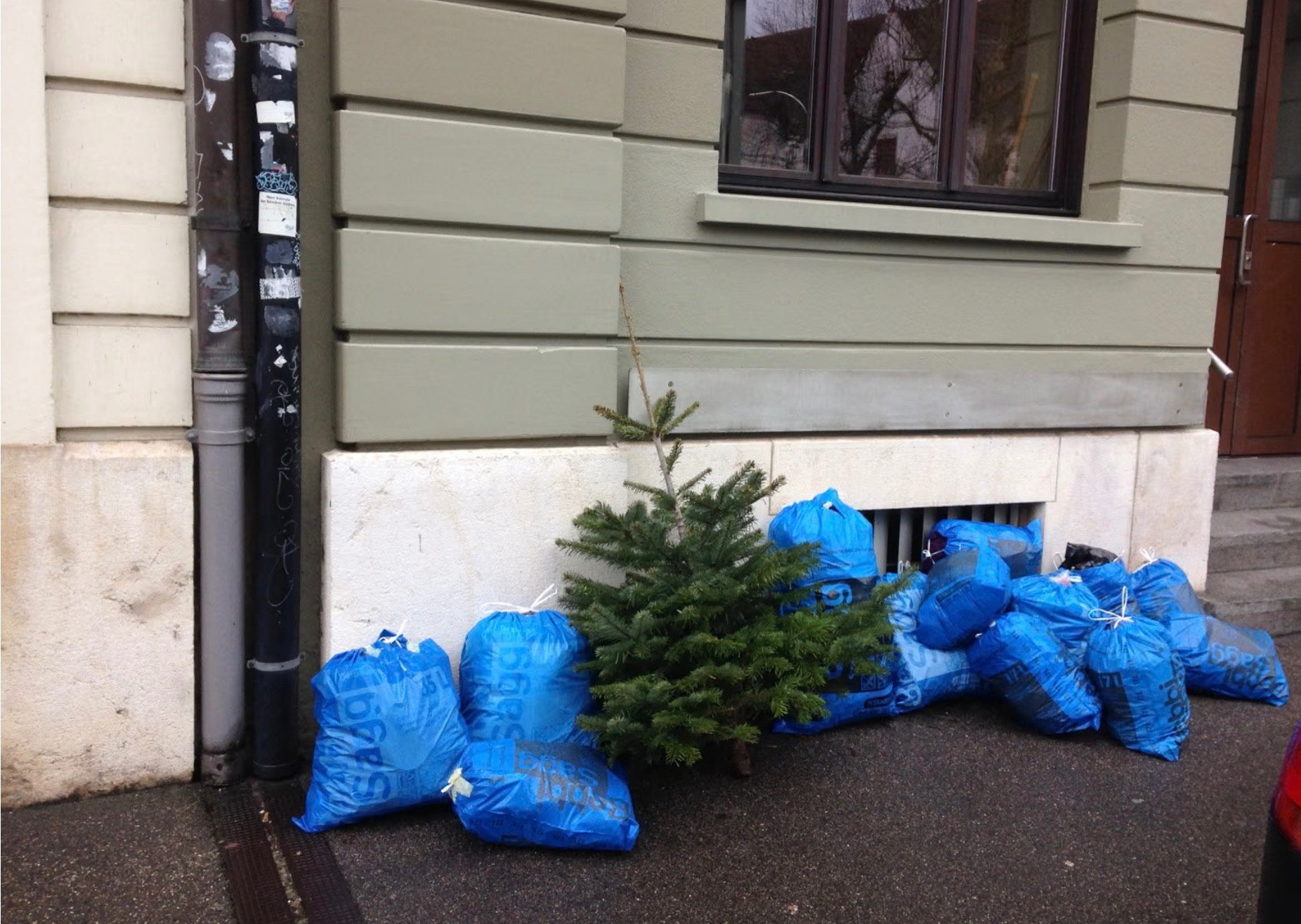 Bäume und Säcke gelangen gemeinsam in die Kehrrichtverbrennungs-Anlage. Im Bachlettenquartier, wo die Abfallentsorgung ab 2. Januar über Unterflurcontainer erfolgt, holt die Stadtreinigung alte Weihnachtsbäume montags und donnerstags mit Lastwagen ab. Analog verfahren die Kehrrichtmänner im Erlenmattquartier.