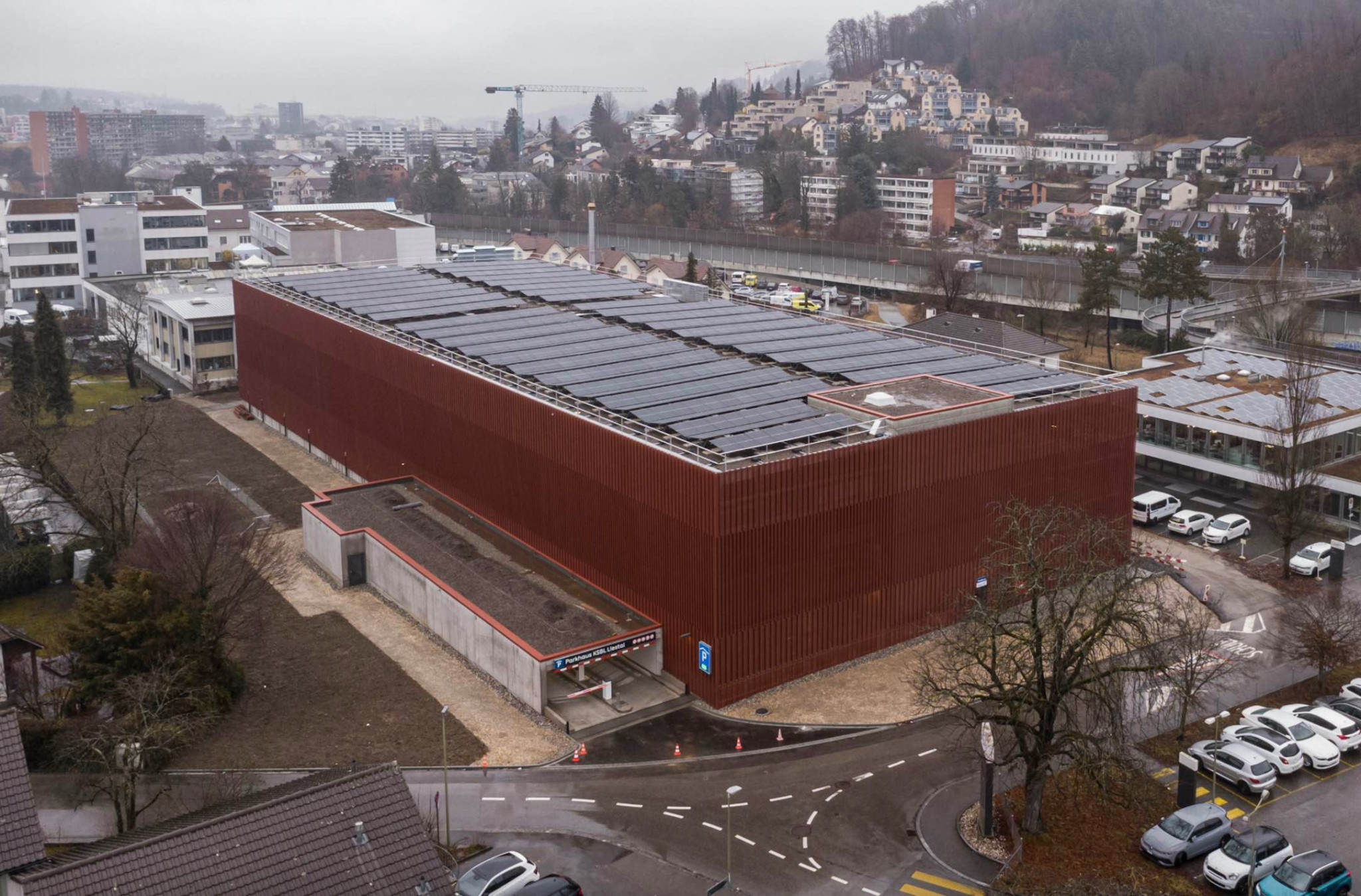 Das Kantonsspital Baselland (KSBL) nimmt am Standort Liestal am 2. Februar das neue Parkhaus in Betrieb. Das mit Solarzellen überdachte Gebäude bietet 640 Autoparkplätze, 21 Motorrad- und 250 Veloabstellplätze. Zudem sind Ladestationen für Elektrofahrzeuge installiert.