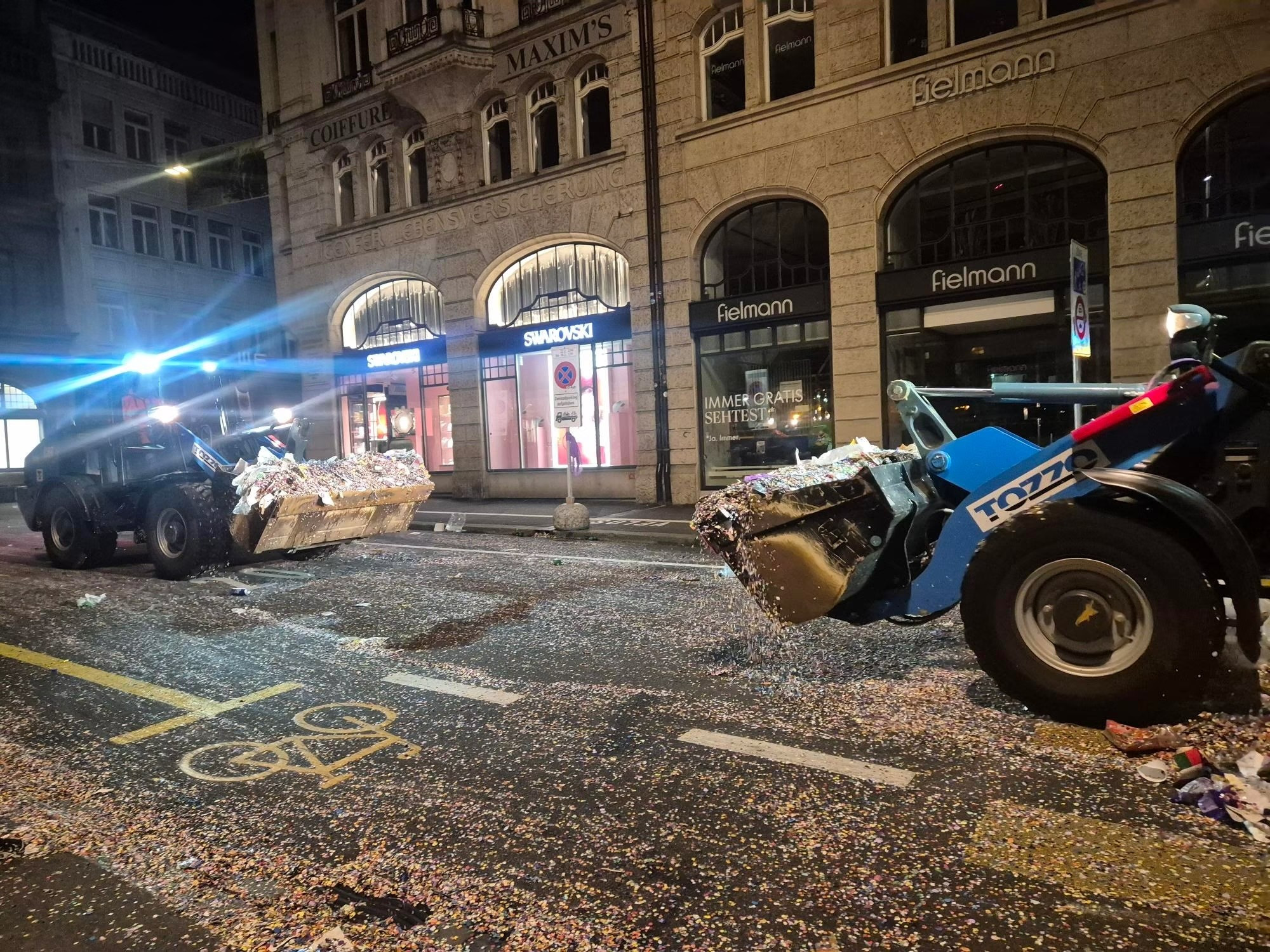 Der Abschluss folgte traditionell mit der sogenannten «Ändreinigung»: Am Donnerstagmorgen ab 4 Uhr standen 210 Mitarbeitende im Einsatz, um den verbliebenen Grobabfall zu beseitigen. Während Wischerinnen und Wischer die Räppli zusammenkehrten, reinigten Maschinen die Hauptachsen. Der gesammelte Abfall wurde anschliessend zur Verwertung abtransportiert.